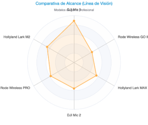 • Alcance:  Los fabricantes suelen citar el alcance en «línea de visión» (LOS – Line of Sight). Un buen sistema de gama media ofrece alrededor de 200-250 metros LOS, como el Rode Wireless GO II (200m) o el DJI Mic 2 (250m). Es importante recordar que este alcance se reduce significativamente con obstáculos (NLOS – Non-Line of Sight).