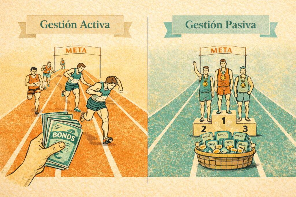 Imagina que hay una carrera de 100 metros. La gestión activa sería intentar adivinar quién va a ganar y apostar todo tu dinero por él. Si tropieza, pierdes.