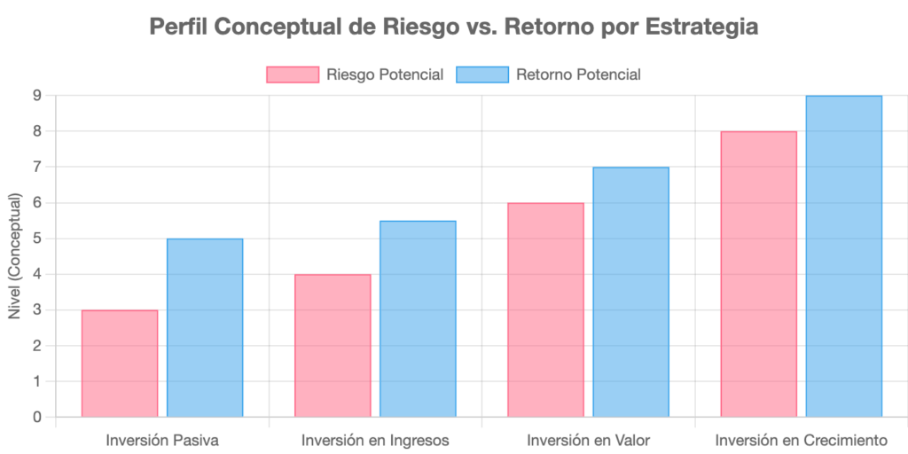 Gráfico conceptual del perfil de riesgo y retorno de diferentes estrategias de inversión.