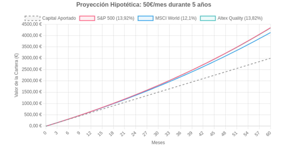 Proyección hipotética del crecimiento de una aportación de 50€/mes durante 5 años.