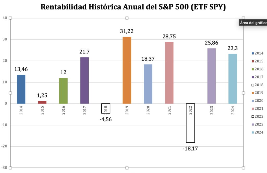 Rentabilidad anual del ETF SPY, un popular replicador del S&P 500. Fuente: FondosIndexados.net.