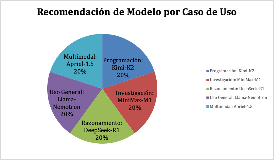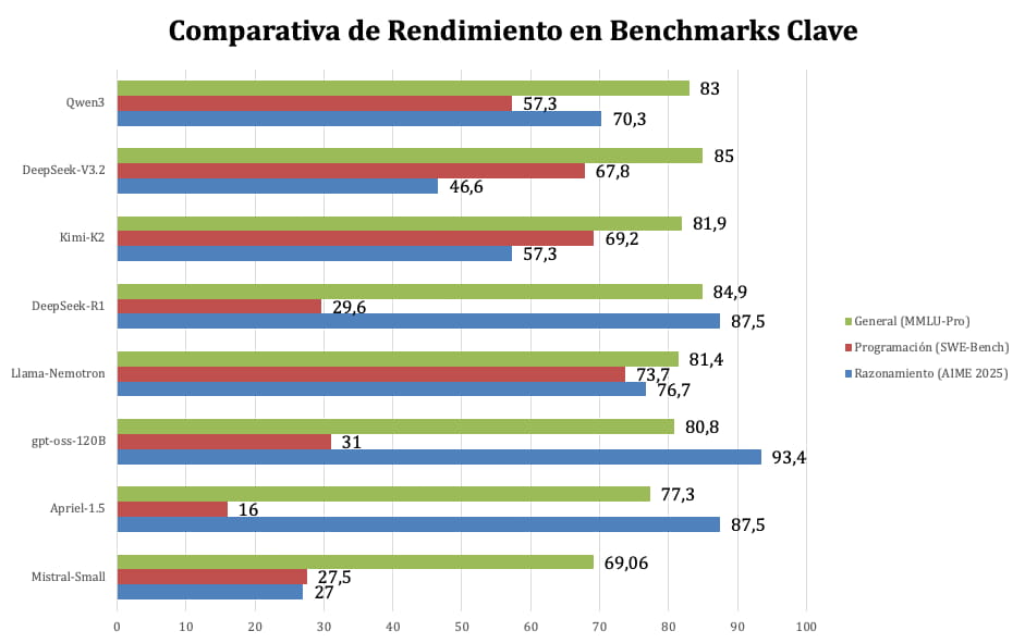 Como muestra el gráfico, no hay un único ganador absoluto. DeepSeek-R1 y Qwen3 demuestran una capacidad de razonamiento matemático sobresaliente. En programación, Kimi-K2 se posiciona como un líder indiscutible, diseñado específicamente para tareas de desarrollo de software. Por otro lado, modelos como Qwen3 y DeepSeek-V3.2 muestran un conocimiento general muy robusto, lo que los hace excelentes para tareas de propósito general. Modelos más pequeños como Apriel y Mistral-Small ofrecen un rendimiento muy respetable para su tamaño, destacando por su eficiencia.