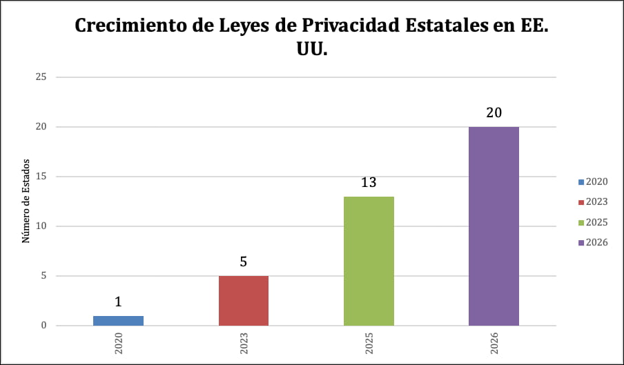 A diferencia de la UE, Estados Unidos carece de una ley federal de privacidad integral. En su lugar, ha surgido un complejo «mosaico» de leyes a nivel estatal. Para principios de 2026, alrededor de 20 estados ya cuentan con leyes de privacidad de datos del consumidor en vigor, cada una con sus propios matices y requisitos.